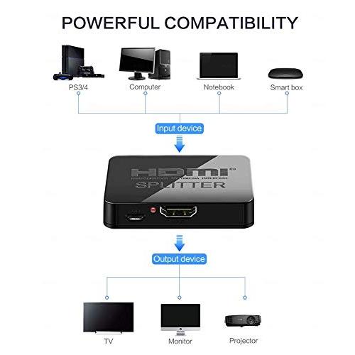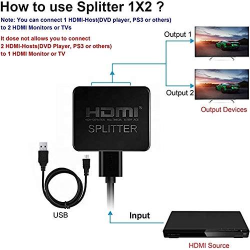 The HDMI splitter use a single HDMI to multiple HDMI Splitter allows one HDMI devices to be split easily to two HDMI compatible monitors or projectors. The Splitter can also be placed at the end of a long HDMI cable to regenerate the HDMI signal