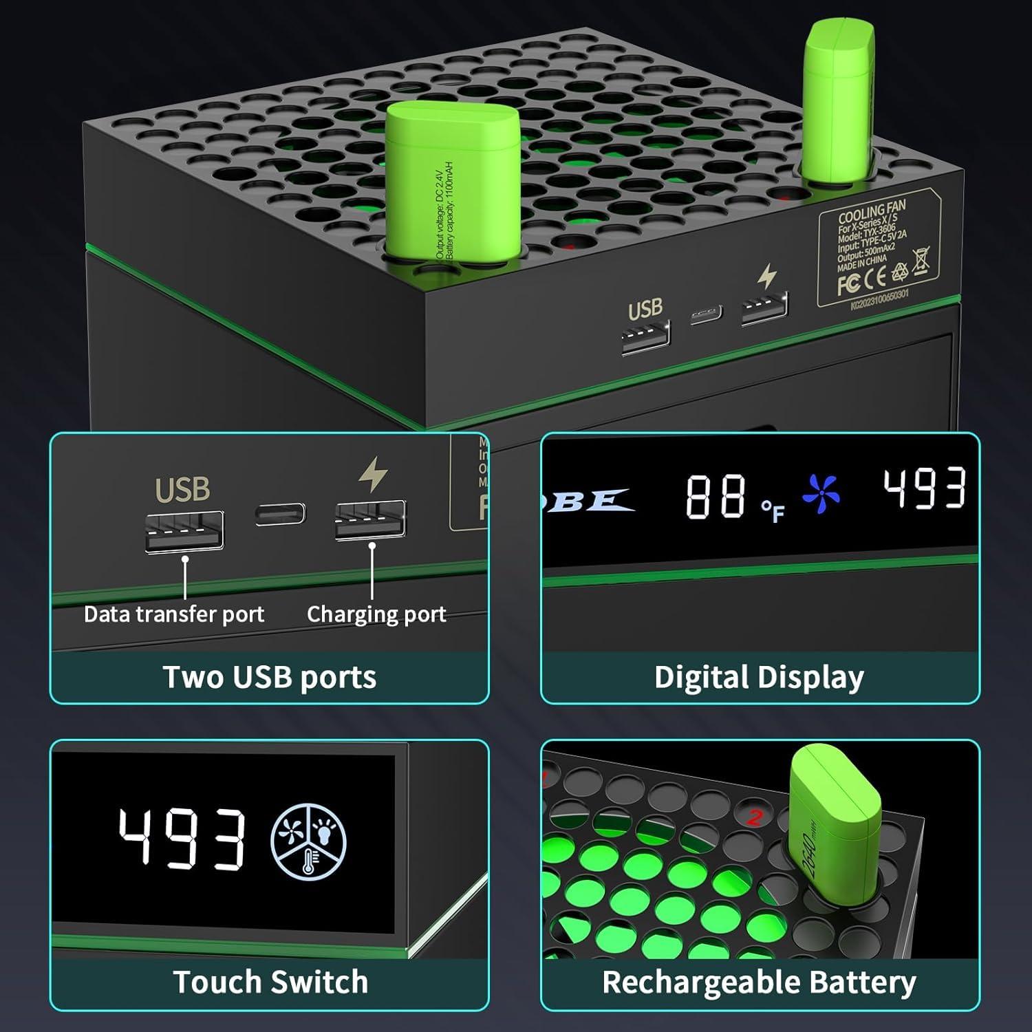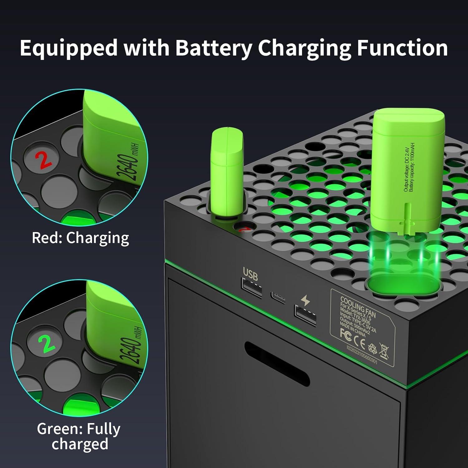 - šćRechargeable Battery and Extra USB PortsćXbox Series X Cooling Fan comes with 2 2640 mWh rechargeable battery packs, compatible with various Xbox controllers. Additionally, Xbox cooling fan features two USB 2.0 ports, one of which supports data transfer. This convenient setup satisfies the diverse needs of Xbox users, allowing you to charge your controller and connect other devices simultaneously.