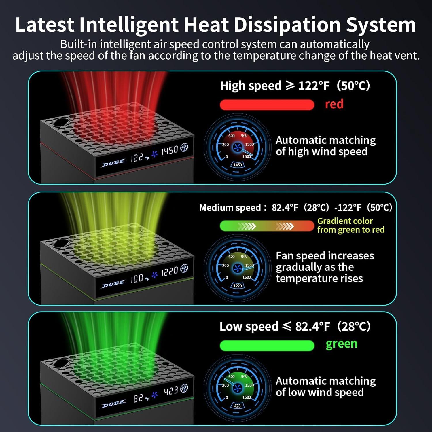 - šćIntelligent Cooling SystemćXbox X series cooling fan has a built-in Intelligent Air Speed Control System. With the temperature sensor detecting the holes, the fan automatically adjusts its speed according to temperature changes. This ensures intelligent cooling for your game console, with low-speed operation when the temperature is below 82.4ā(28°C), gradual speed increase as the temperature rises, and full-speed operation above 122ā(50°C). Keep your Xbox Series X cool and prevent overheating