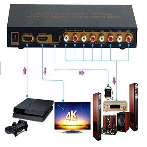 Decodes uncompressed HDMI LPCM 7.1 or 5.1 into multi-channel analog surround sound for amp, receiver or powered speakers.