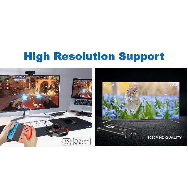 4K 1080P 60fps HDMI Video Capture Card with Audio Input/Output, HDMI Signal Loop Out, perfect for video conference, game collection, live broadcasting, multimedia teaching scenario and so on.
