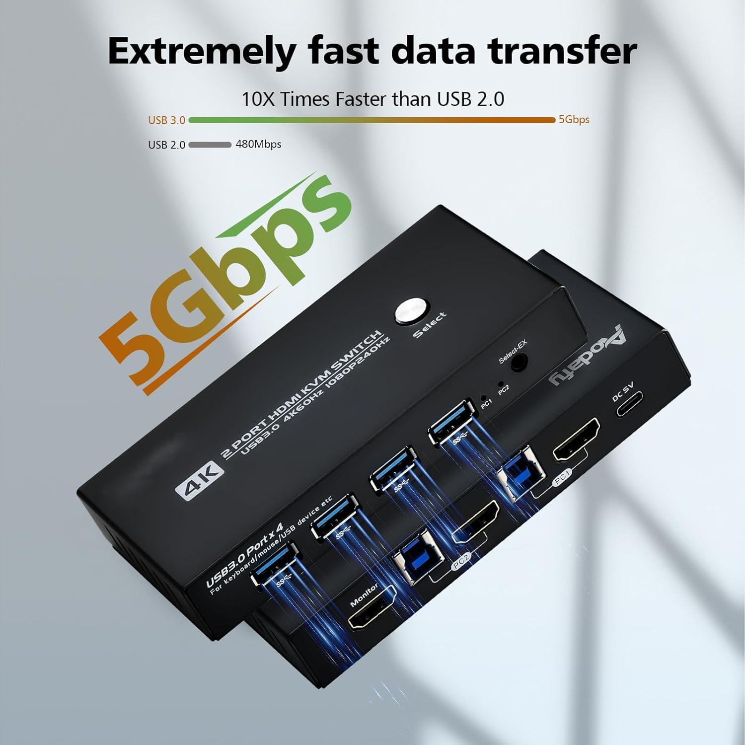 - KVM switches feature four USB 3.0 ports, allowing you to connect mice, keyboards, and other USB devices, providing ample connectivity options without worrying about insufficient ports. This HDMI KVM switch is equipped with an EDID emulator. When you connect a laptop to a larger display via KVM, it can intelligently retain your originally set resolution, window position, and size during switching, eliminating the need for frequent adjustments and greatly enhancing your workflow smoothness and efficiency. Our 2 port KVM switch boasts 4K 60Hz high-resolution display, delivering smooth and vibrant visuals that will immerse you in your professional work or entertainment. Equipped with EQ enhancement functionality, this KVM switch effectively handles signal attenuation and distortion, ensuring clear and stable signals even at a transmission distance of up to 100 feet (50-foot input and 50-foot output).